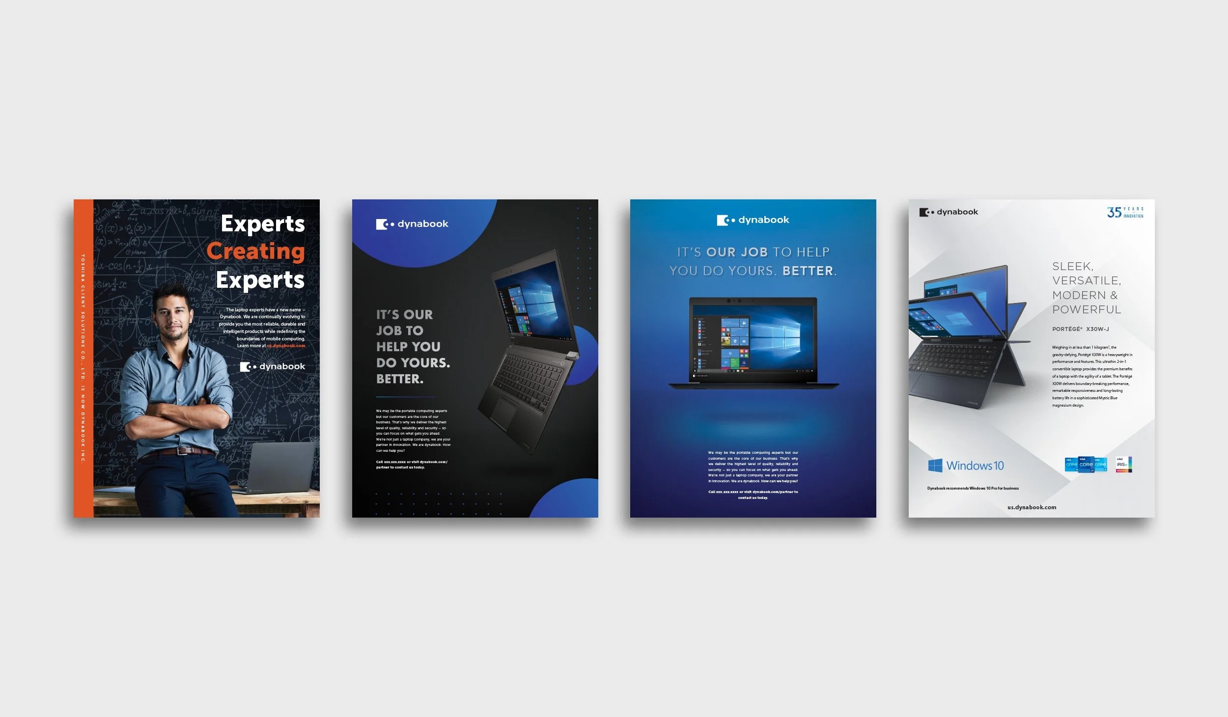Dynabook rebranding: these were explorations and then turned into actual use designs. Since then, they have changed but the agency I worked for tried to give a more personable and yet professional look. Here were some of my takes.